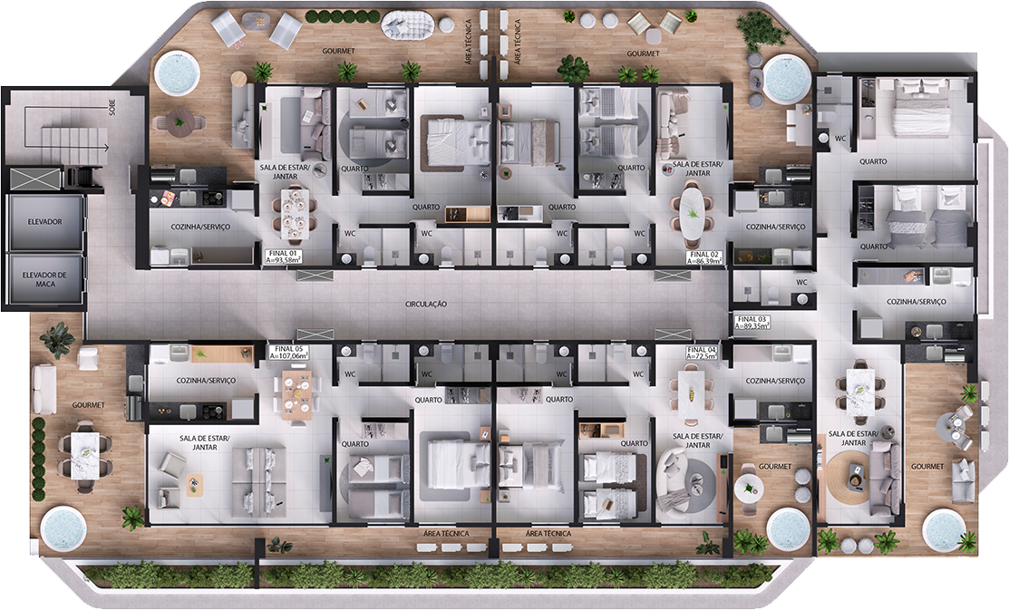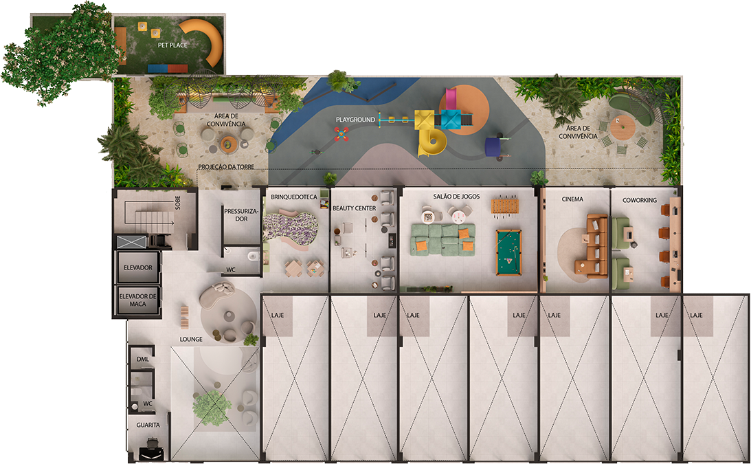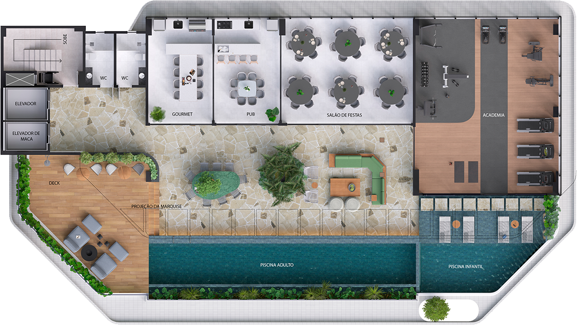 Em torre única, o empreendimento reúne lazer panorâmico, conveniência no térreo e plantas inteligentes — dos studios aos gardens e coberturas — criando um ambiente pensado para viver bem e investir com segurança.